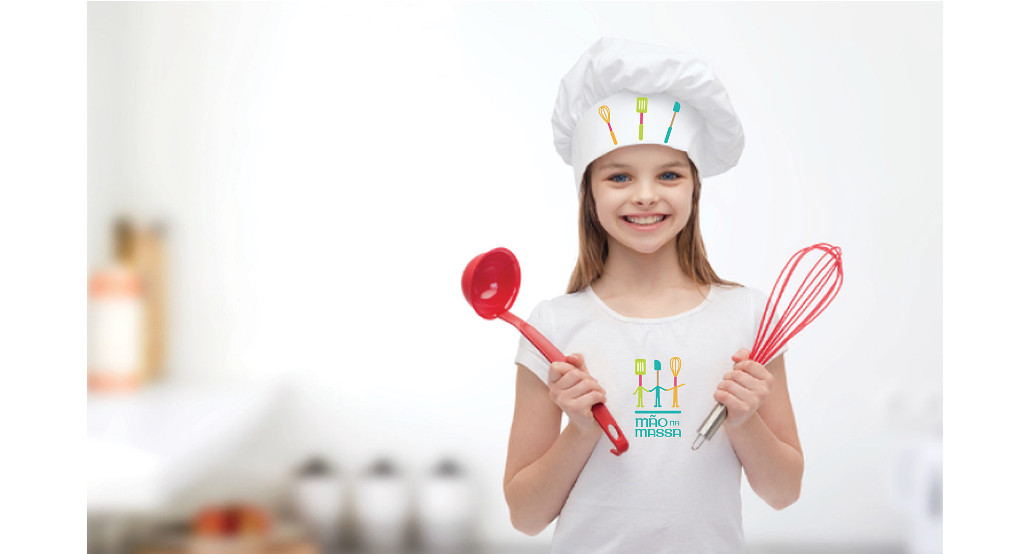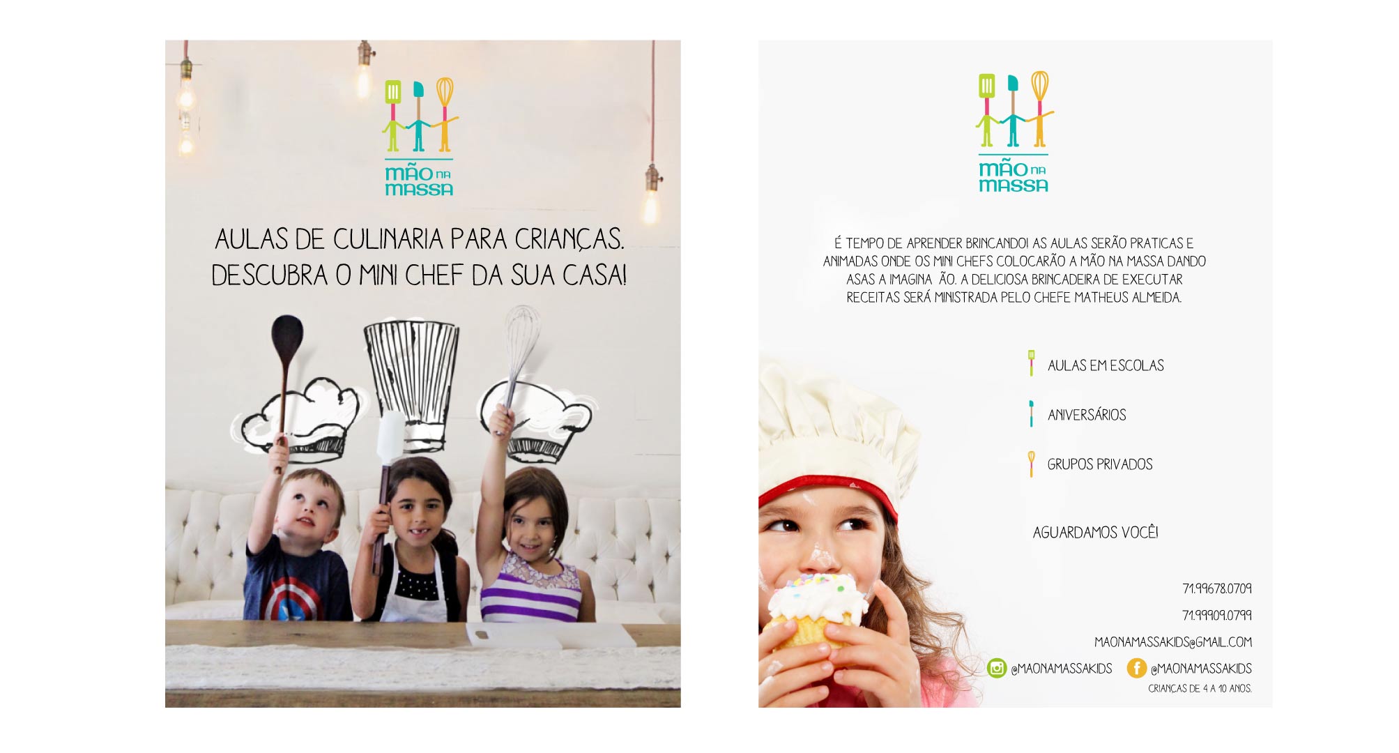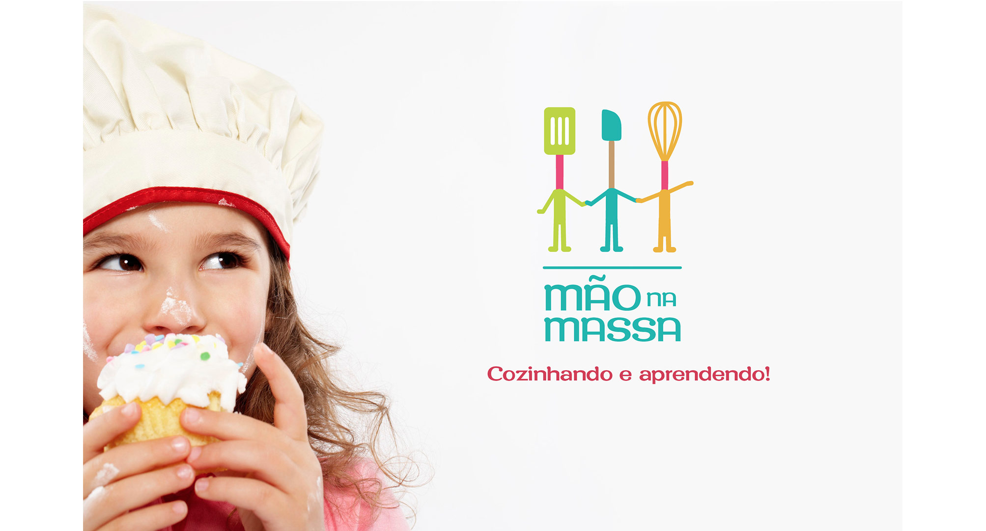 The Mão na Massa branding is fun and colorful, a company that teaches kids to cook and bake, they host classes in school and private parties and events.